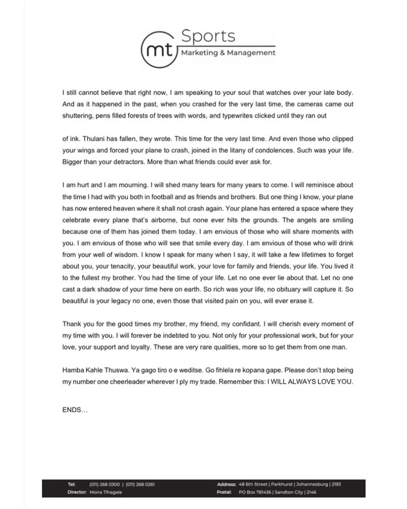 In their own press release, thulani thuswa, as spokesperson for mamelodi sundowns said, 'there is a saying: Keep that barber , don't keep goals kphela. thulani thuswa (@thulanithuswa) added, keep it mfanakithi, it suits you. #noko the champ (@thapelothobeja9) said — thulani thuswa (@thulanithuswa) september 27, 2020. The charismatic thuswa‚ who was loved by the sundowns supporters and the media alike‚ died in a car. News of thuswa's tragic passing started circulating on social media early on sunday morning thulani met his untimely passing this morning, sunday 6th june 2021.